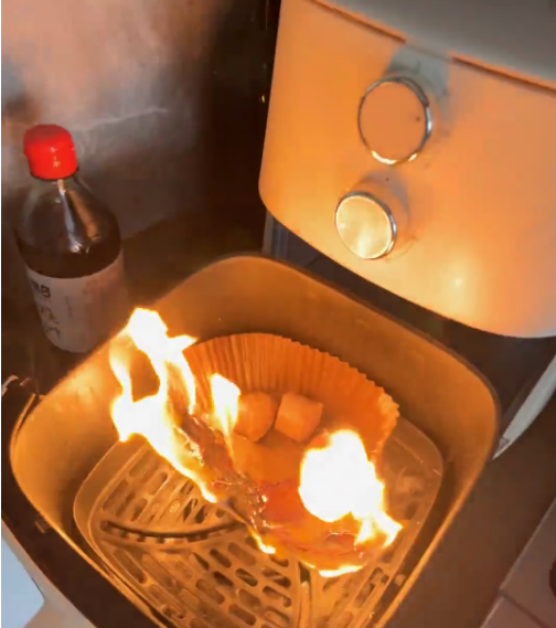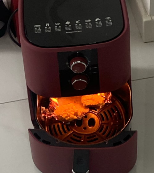 当使用空气炸锅时,内部若是摆放有燃点低、重量轻的烘焙纸、吸油纸等,且没有被食材完整覆盖,很可能就会被热风卷起,触碰到发热管被点燃,引起机器短路或者起火。