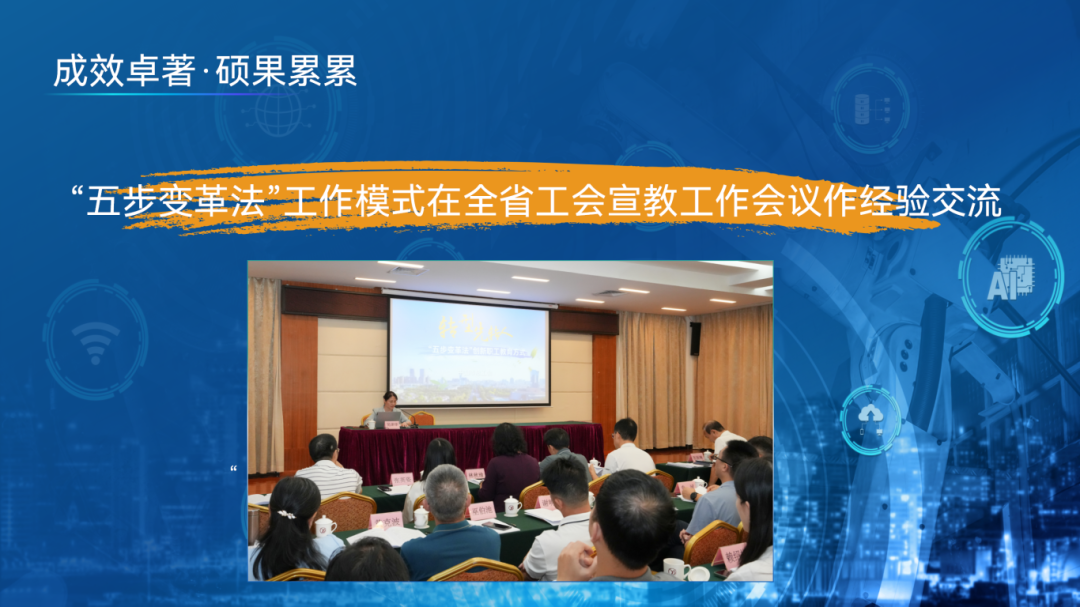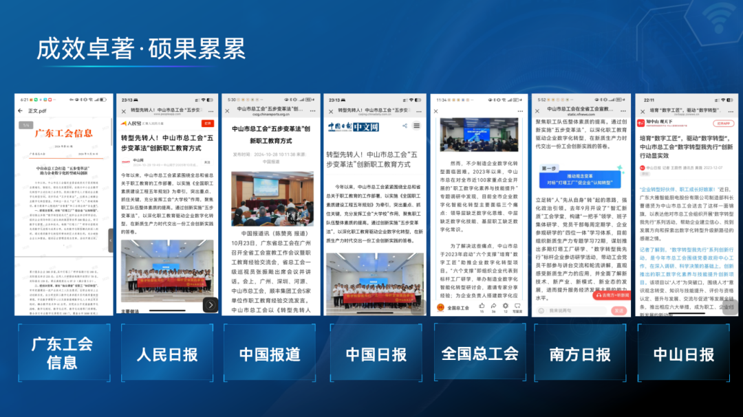 “五步变革法”项目启动至今,已服务超过300家企业,服务职工超过10000人。《大力培育“数字工匠”助力企业数字化转型》获广东省总工会工会工作创新一等奖;“五步变革法”工作模式也在今年全省工会宣教工作会议作经验交流,入选全国重点工作创新案例,被《人民日报》《工人日报》《广州日报》《南方工报》等多家中央、省市媒体、全国总工会公众号专题宣传报道。