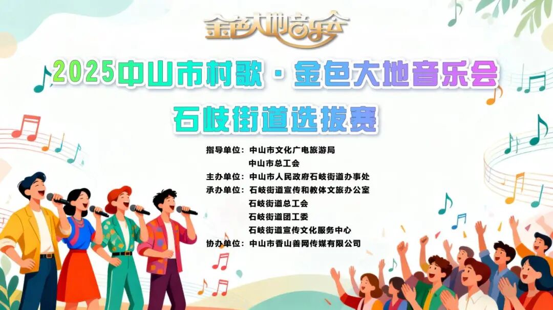 为深入挖掘中山本土文化内涵,传承发展独具特色的村歌文化,展现石岐街道的人文魅力与时代风貌,2025中山市村歌・金色大地音乐会石岐街道选拔赛将于10月25日晚19:30在石岐文化公园盛大启幕。现面向全街道公开招募参赛队伍,诚邀社会各界共同参与这场兼具传统底蕴与时代风采的音乐盛会,活动即日起开放报名通道。