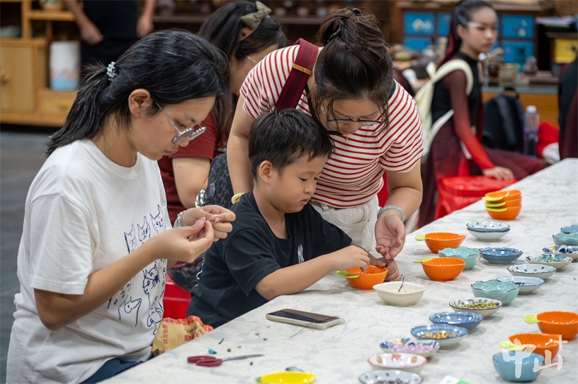 值得一提的是,这场文化盛宴从下午便拉开序幕。集市里20余个创意摊位涵盖文创、非遗、美食等丰富内容。非遗亲子体验区里,陶艺拉坯、彩瓷绘制、沙画创作等互动项目吸引众多家庭参与,孩子们在专业指导下感受到了非遗技艺的魅力。