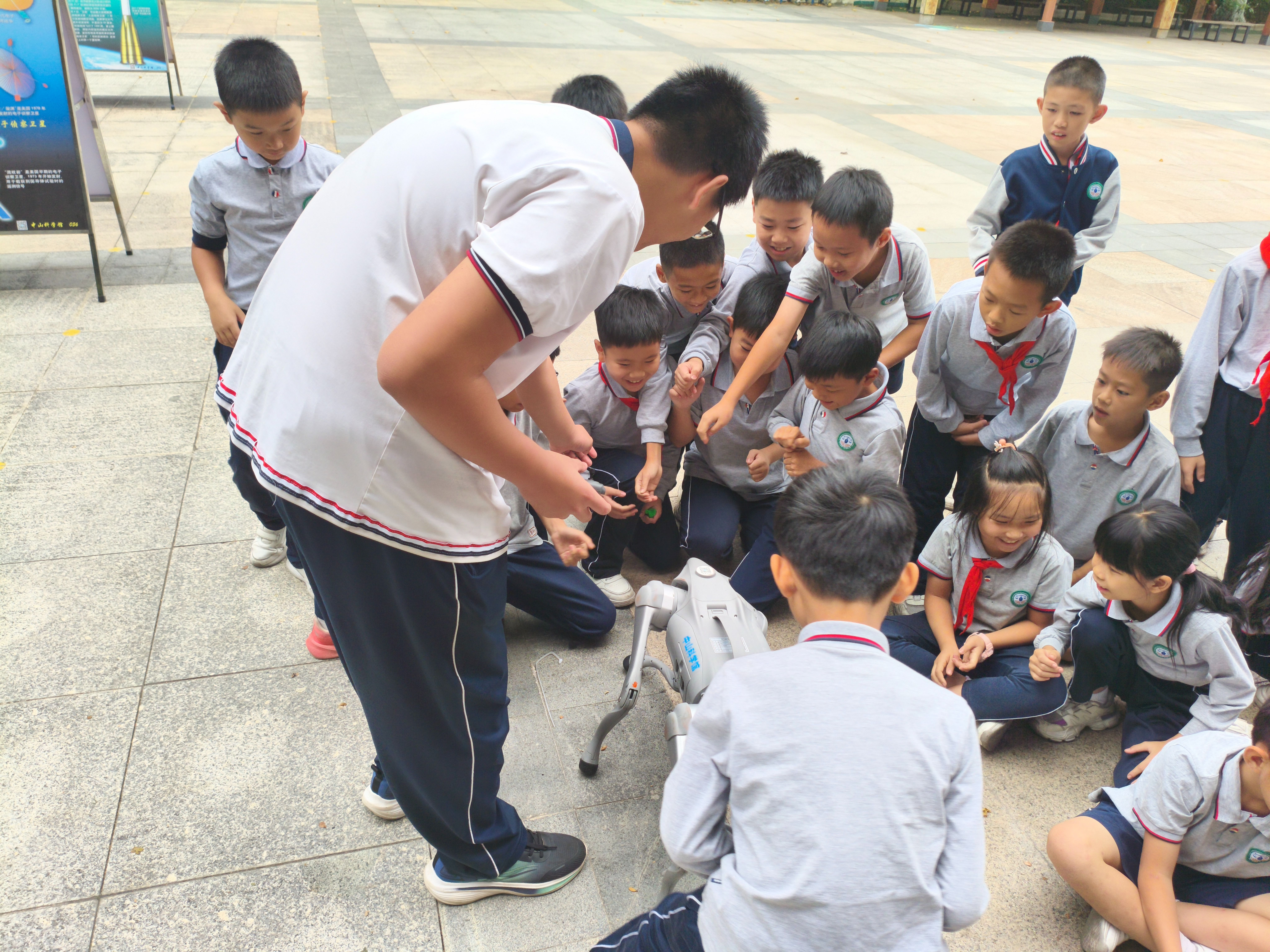 一只灵活的机械狗在校园里跳跃、转圈,孩子们围成一圈,惊呼声和笑声此起彼伏。这是中山市火炬科学技术学校(简称“火炬科校”)科创志愿者团队开展科普活动的场景。