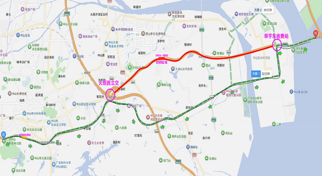 翠亨东收费站出高速路→未来大道→翠亨快线→南阳山隧道→ 火炬西立交→中山城东收费站进入→中阳高速。