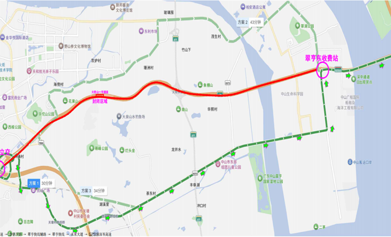 ②广澳高速(G0425)往深圳方向的车辆绕行路线:中山城东收费站出高速路→中堡下街→翠亨快线辅路→翠亨快线→未来大道→翠亨东收费站进入深岑高速。