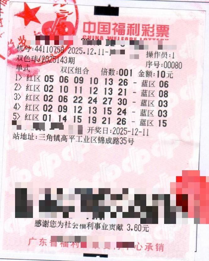 好运并未停歇。紧接着,2025年12月11日晚,中国福利彩票“双色球”第2025143期开奖,当期全国共中出7注一等奖,单注奖金8038443元。其中1注再度花落中山,由中山市三角镇高平工业区锦成路35号的44110758号福彩销售站点售出。