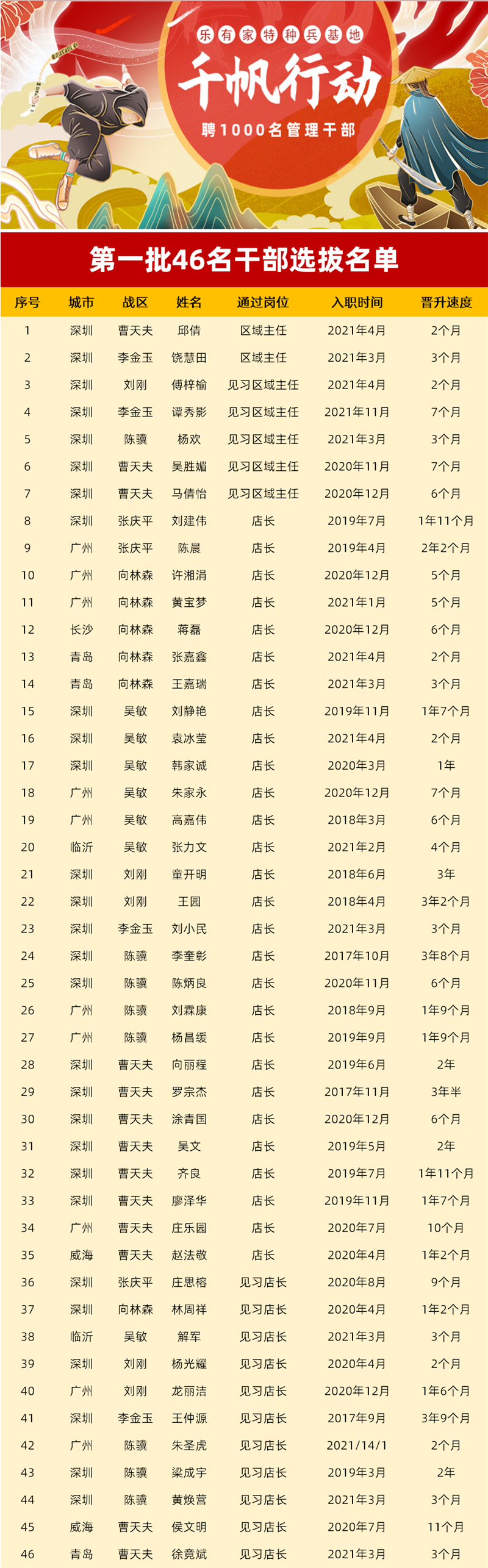 6月9日,经过现场严格的公开面试、终审,“千帆行动”第一批优秀干部已经脱颖而出。这些管理干部将赴任深圳、广州、威海、青岛、潍坊、临沂、长沙等地,成为乐有家“百城万店”拓展的中坚力量。