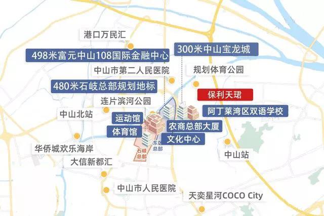 除了上述学校资源外,小区未来公建配套还包括了公交站、派出所,加上一街之隔的8万平方米中山宝龙城商业中心(计划2023年开业)、富元中山108城市综合体等丰富商业配套,小区下楼即达滨水公园、体育公园,未来业主生活休闲、消费等配套无忧。