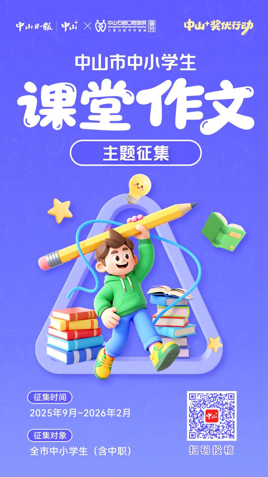 “跟着课本学写作”中山市中小学生课堂作文主题征集活动来了!由“中山+”客户端联合中山石岐简牙口腔医院举办的征稿活动将持续一整个学期,征稿内容就是大家在课堂上练笔的作文/单元作文。
