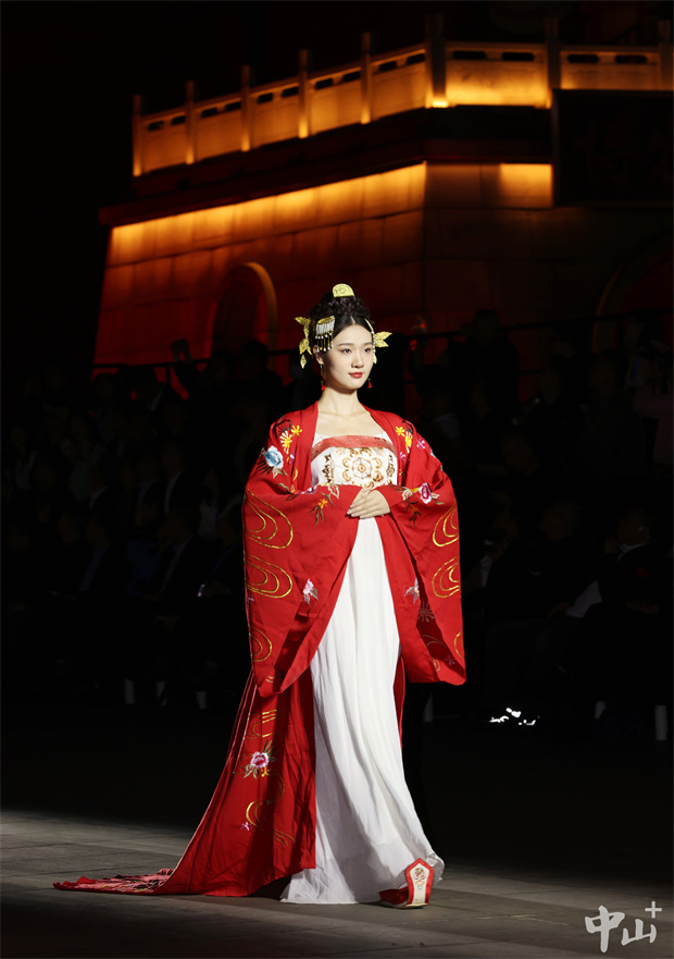 “过往秀”环节以红博城古建筑为舞台,借鉴“长安十二时辰”“长安三万里”的场景设计,身着唐装汉服的模特搭配凤凰灯光秀与火凤衔壶的唯美意境登场。衣袂翻飞间,汉唐锦绣风华被展现得淋漓尽致。“灯光打在古建筑上,配上传统服饰,就像走进了画里。”有观众由衷赞叹。