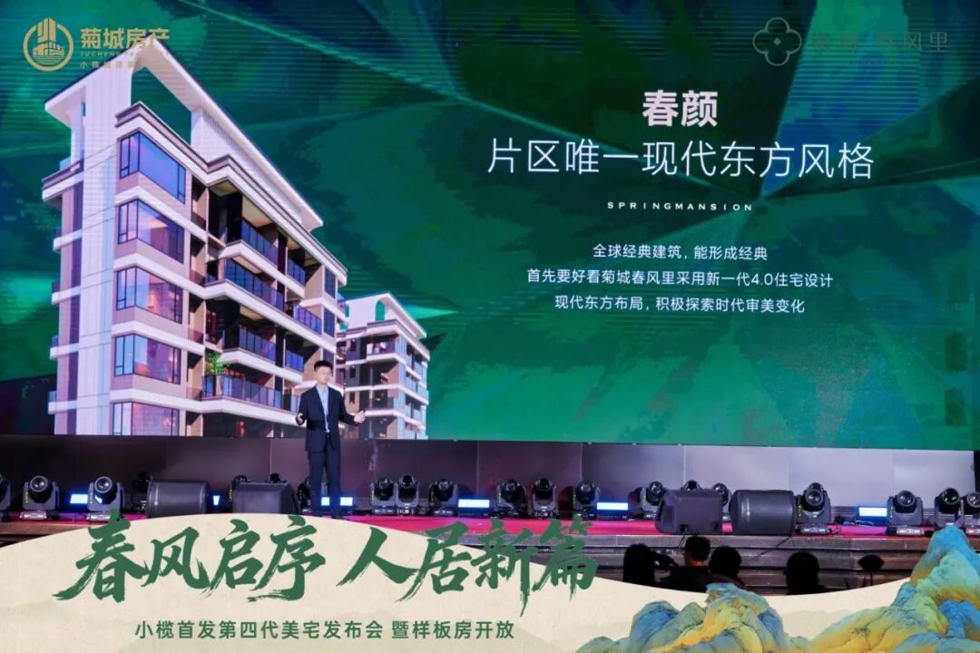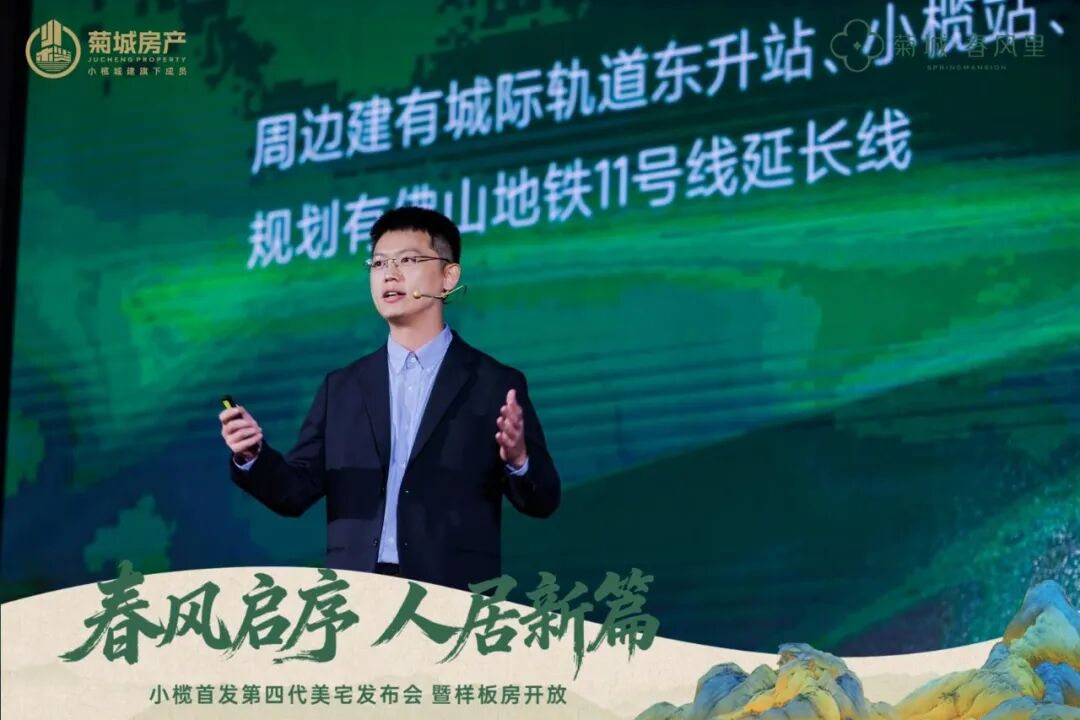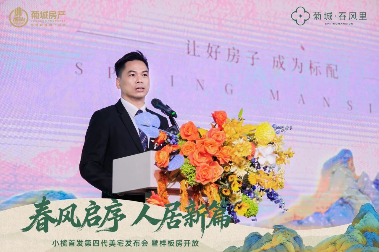 在全场期待下,发布会进入核心环节——菊城·春风里产品的惊艳亮相,菊城房产 产品技术研发部 副总监 贾煜东 为在座的嘉宾全面解读了项目产品。作为小榄首个四代宅项目,春风里以“空中庭院+垂直绿化”为核心,打破传统住宅局限。