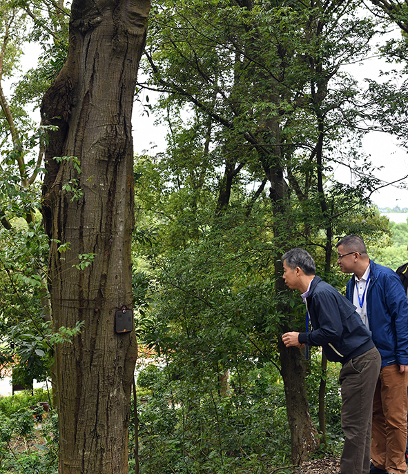 在古树公园里查看古树的年龄。