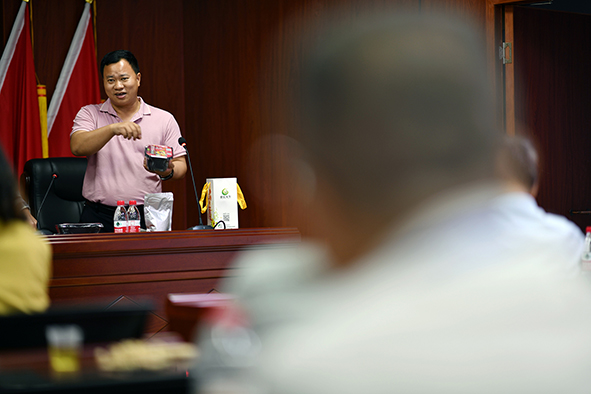 高围村村委会里,河源市耕耘天下农业发展有限公司执行董事谢伟辉给采访团介绍他们用“五指毛桃”制作的汤类预制菜。