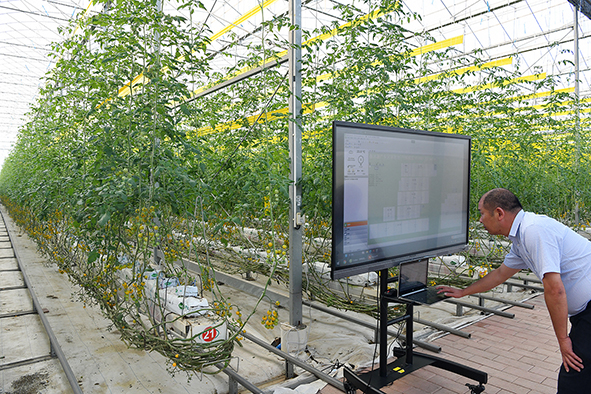 春沐源绿色生态智慧农业产业园工作人员在把种植大棚的实时管理数据在屏幕上呈现出来,准备给参观的人员讲解高科技在园区的使用情况。
