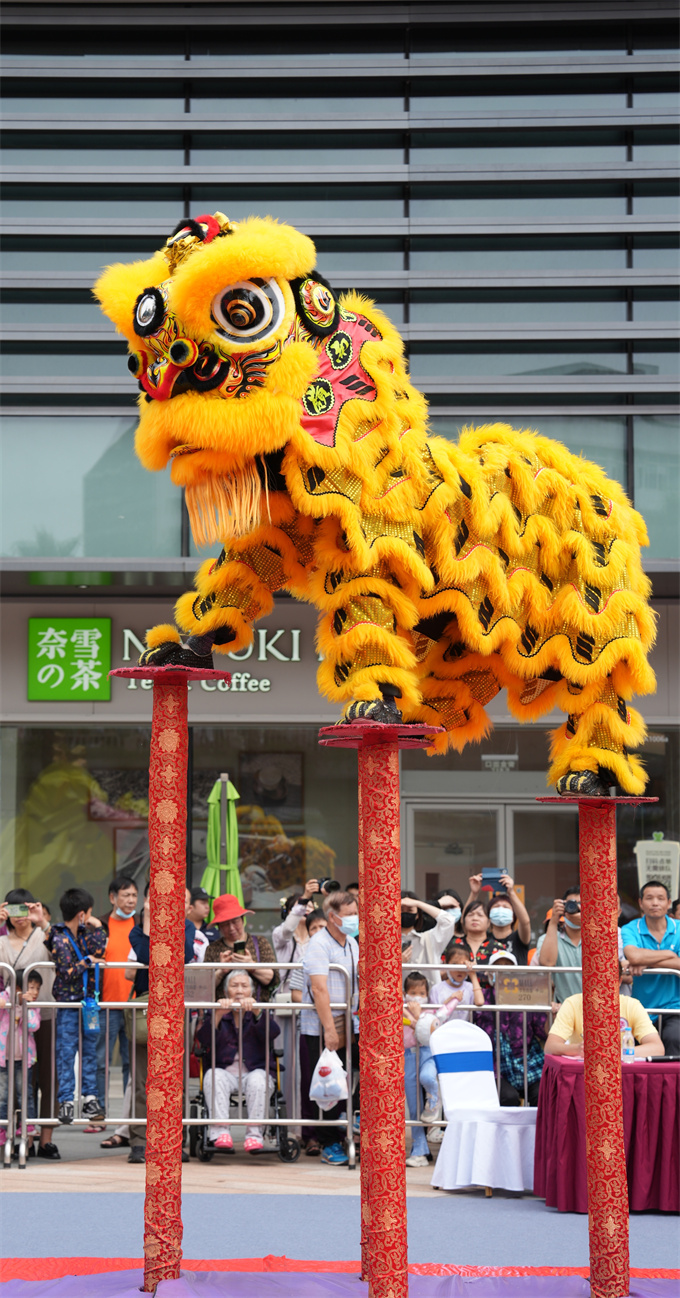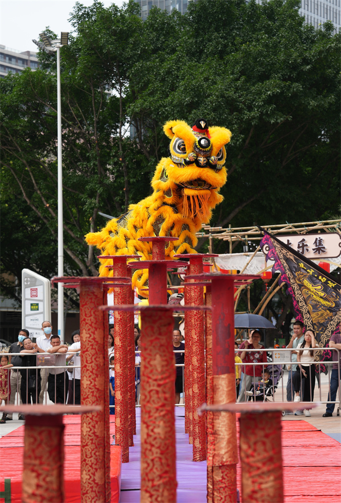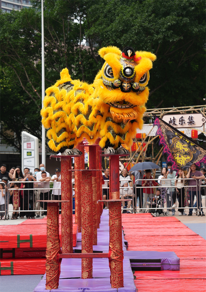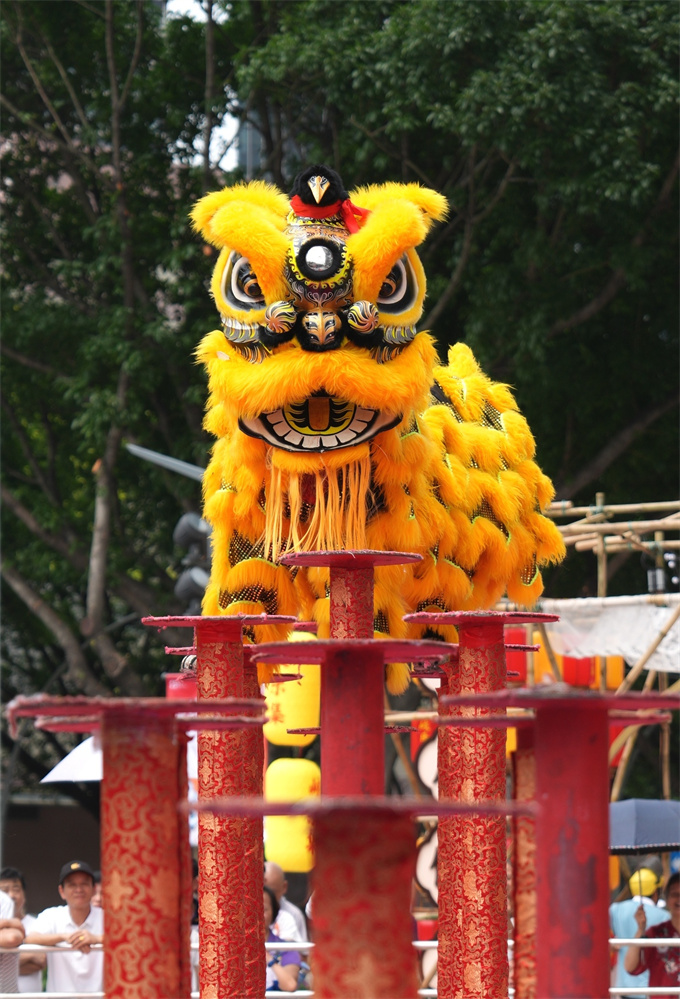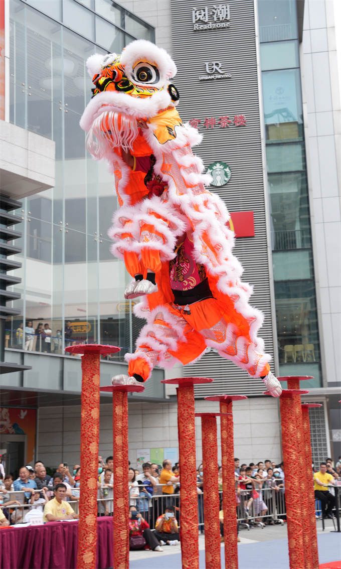 随着铿锵有力的锣鼓响起,8支南狮队伍一个个飞身上桩,并在桩上将“搔头摆尾”“仰视低顾”等传统动作演绎得栩栩如生、惟妙惟肖,获得了在场观众的阵阵掌声。