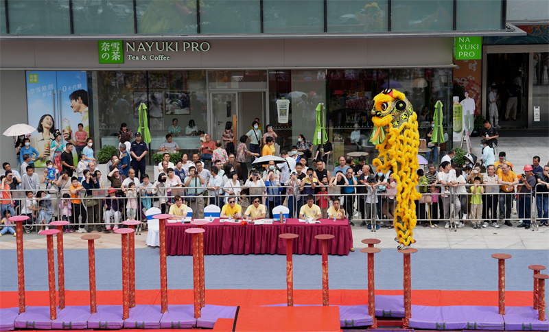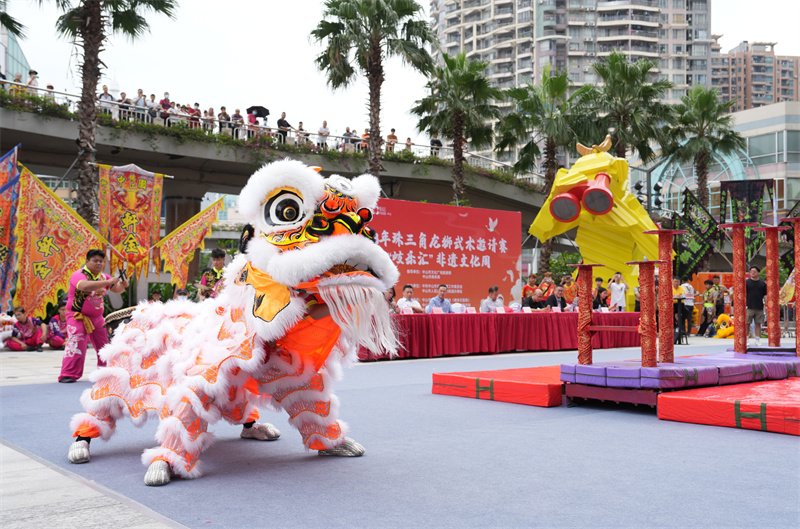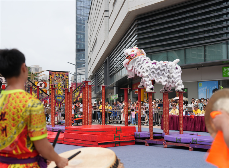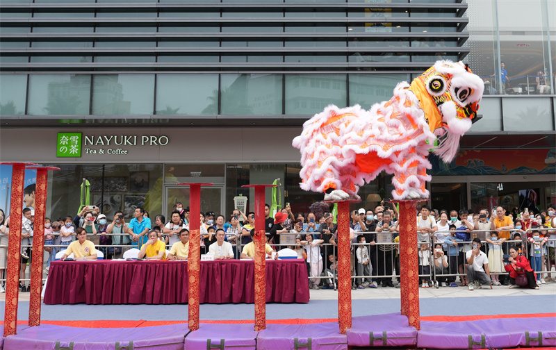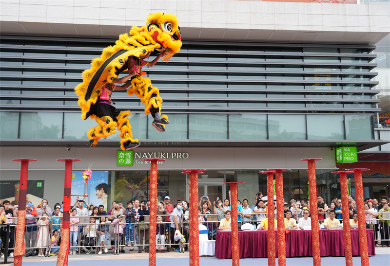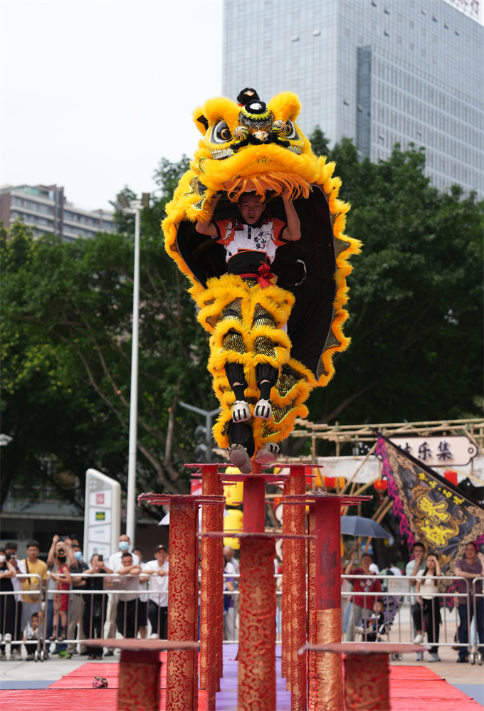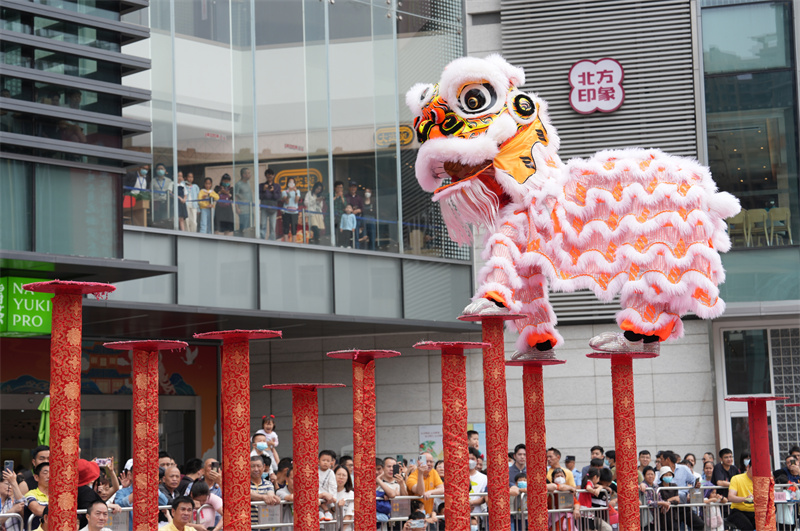 随着铿锵有力的锣鼓响起,8支南狮队伍一个个飞身上桩,并在桩上将“搔头摆尾”“仰视低顾”等传统动作演绎得栩栩如生、惟妙惟肖,获得了在场观众的阵阵掌声。