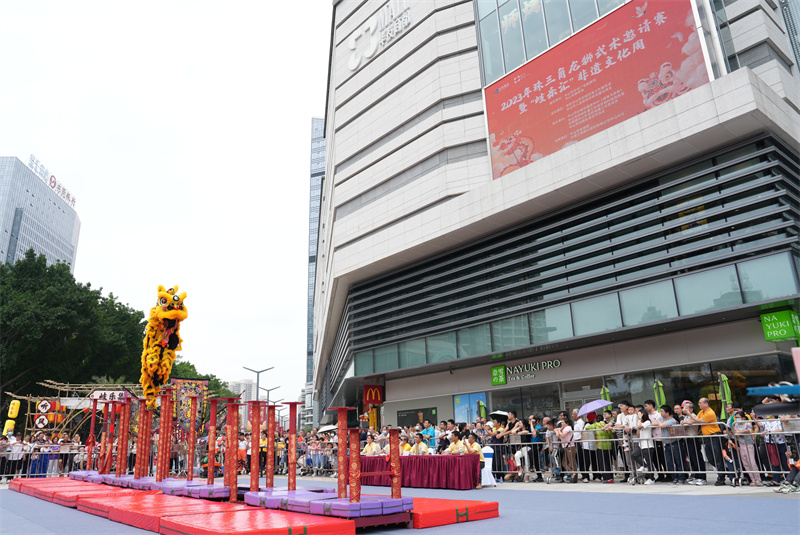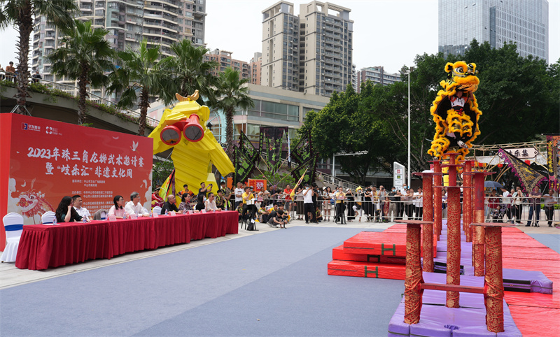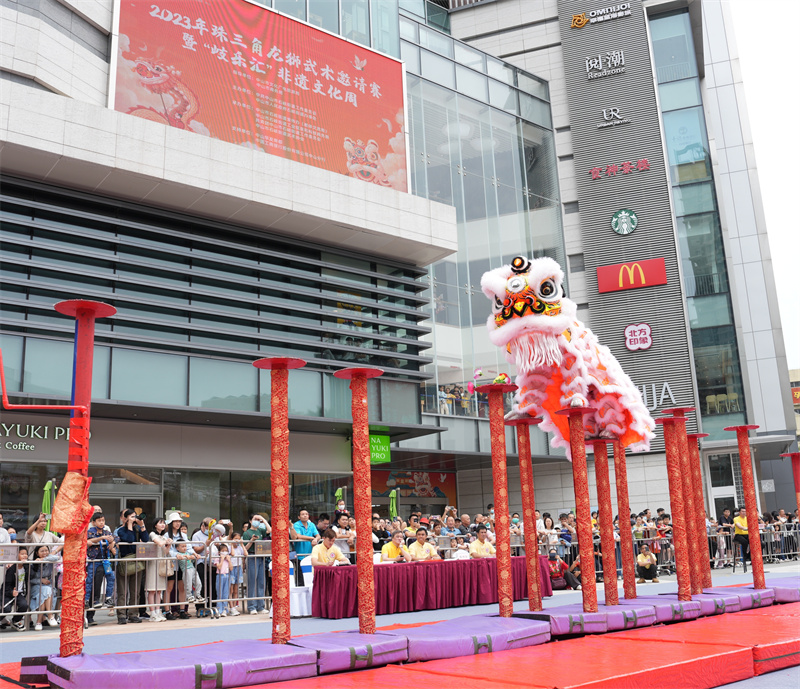 5月1日上午10时,随着阵阵锣鼓声响起,在石岐街道华发商都门前广场,来自深圳、佛山、中山等地8支南狮队伍同场竞技,为争夺2023珠三角龙狮武术邀请赛(高桩南狮项目)金杯而一决高下。