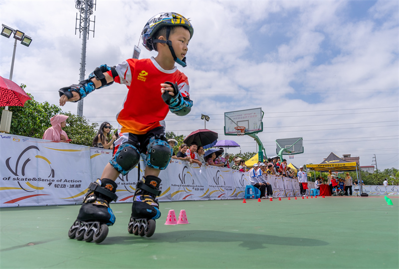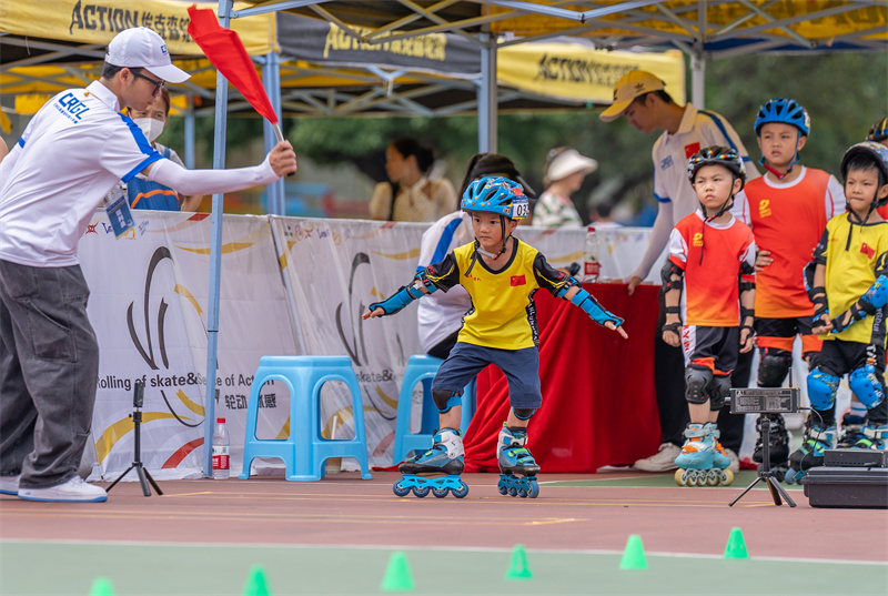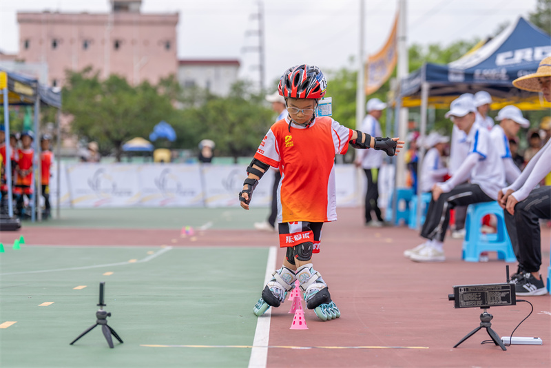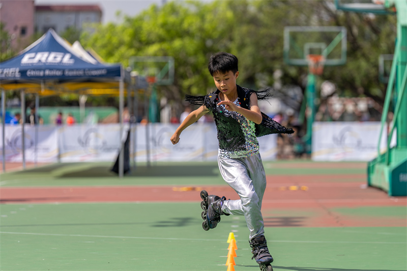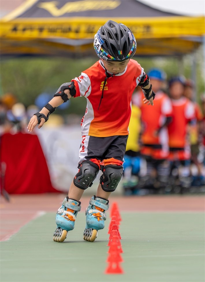 比赛中,小选手飞快过桩,将轮滑运动的速度与激情表现得淋漓尽致。(摄影:黄艺杰)