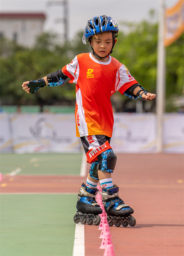 据悉,此次比赛分为自由式轮滑和速度轮滑两大类,其中速度轮滑设100米、200米、300米、500米等项目;自由式轮滑设花式动作计时、套路对抗、速度过桩等项目。图为小选手在奋力比赛。(摄影:黄艺杰)