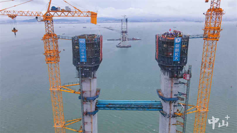 2021年6月17日,大桥东索塔塔柱完成封顶。主塔为钢筋混凝土结构,共浇筑混凝土约5万立方米,钢筋用量高达7400吨,相当于一座埃菲尔铁塔。7月19日,大桥西主塔完成封顶,大桥建设由此全面转入上部结构施工阶段。