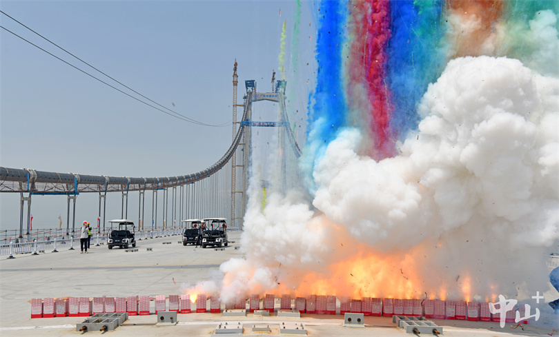 2023年4月28日 随着最后一片钢箱梁销接完成,庆祝深中大桥顺利合龙的烟花燃起。明剑 摄