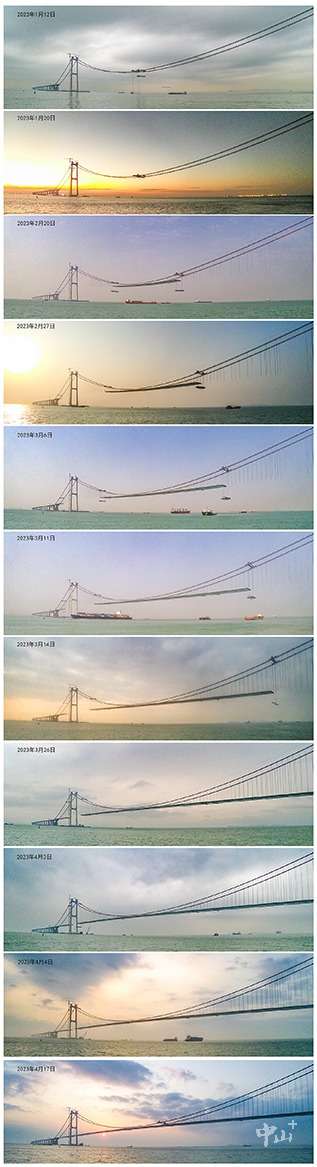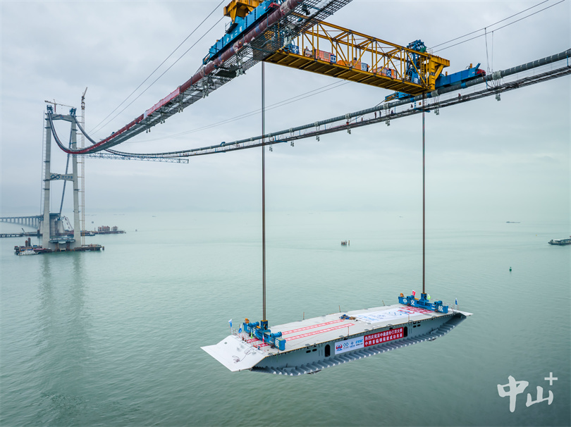 2023年1月12日,深中大桥首片钢箱梁完成吊装,标志着大桥进入上部结构钢箱梁吊装施工新阶段。4月28日,深中大桥顺利合龙;11月1日,深中通道深中大桥开启钢桥面铺装施工。