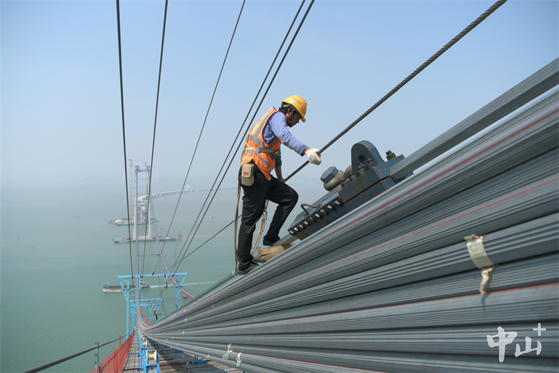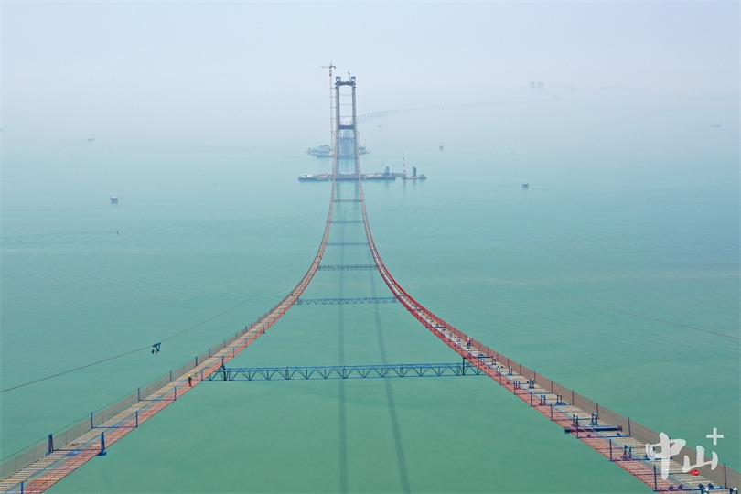 2022年2月15日,深中大桥先导索顺利过江,大桥实现东、西主塔“千米一线牵”。为接下来深中大桥上部结构牵引系统安装及猫道架设奠定重要基础。5月15日,大桥完成首根主缆索股架设。大桥上下游共设两根主缆,单根主缆由199根索股组成,每股又由127根高强钢丝组成。这是我国自主研发的强度达2060兆帕的钢丝首次大规模应用于桥梁建造。