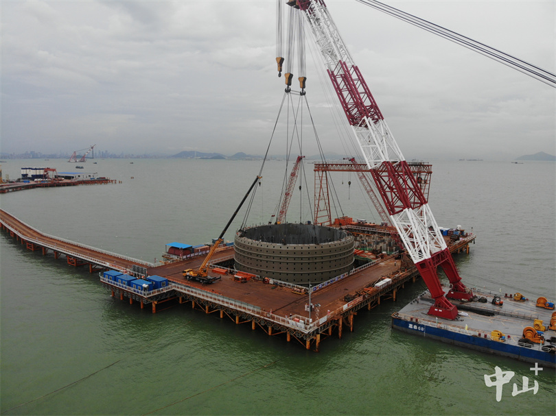 2019年7月4日,大桥东索塔首个巨型钢吊箱成功下放到位;2019年11月6日,大桥西索塔的首个钢吊箱成功下放。