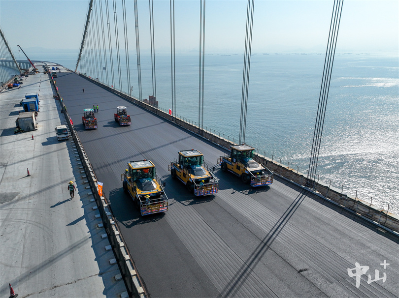 2023年11月1日 深中大桥开启钢桥面铺装施工。沈仲 摄