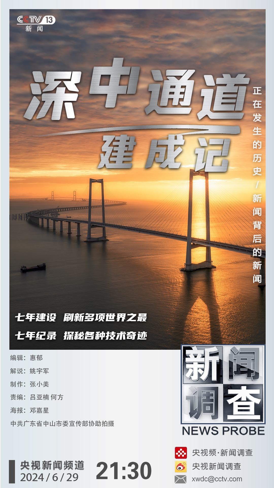 七年建设,刷新多项世界之最;七年纪录,探秘各种技术奇迹。中央广播电视总台央视新闻频道,6月29日晚9时半,《新闻调查》,共同关注深中通道建成记。