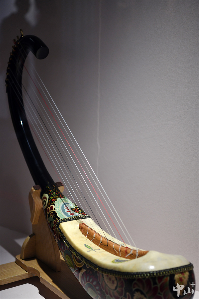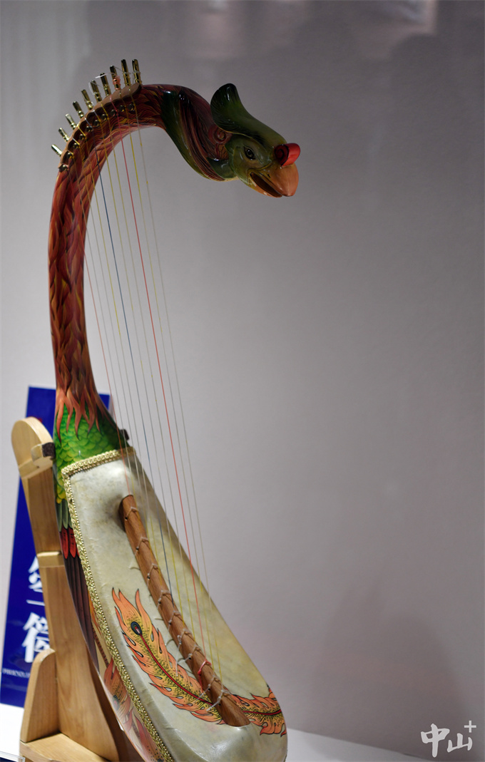 ▲展示厅所展示的有古竖箜篌、卧箜篌、凤首箜篌、出土箜篌等。