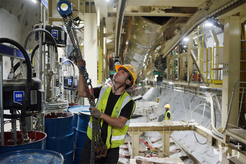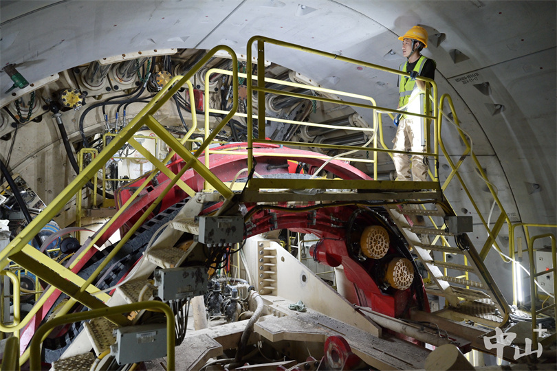 ▲1月8日,在岐江新城站至岐江道站隧道内部,盾构机正在进行掘进作业,两位工人正在准备进行隧道管片拼装作业。