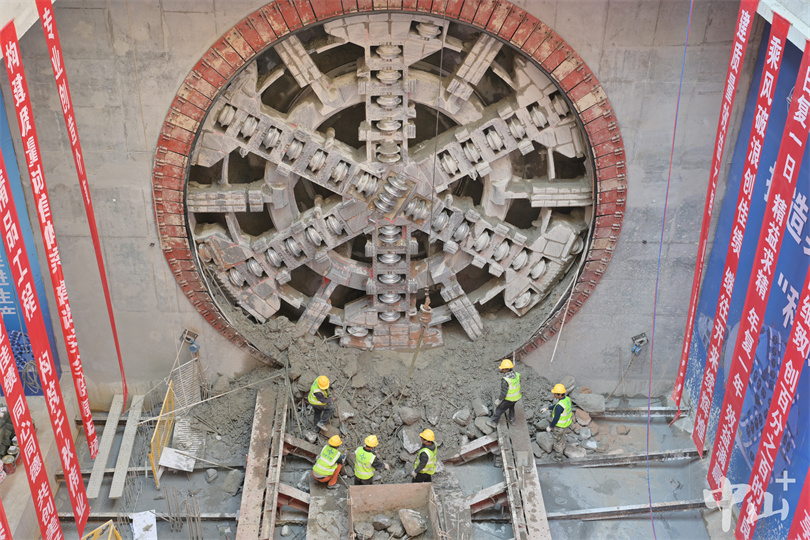 “中交天和498号”此次的“主线”任务为全长716.2米隧道,它从岐江新城站(原世纪路站)始发后,往东北敷设,到达岐江道站(原岐江新城站)进行接收。临近接收洞门时,“中交天和498号”放慢掘进的节奏,以每分钟一厘米的速度缓缓推进,确保盾构贯通轴线与隧道设计轴线重合。最终,它旋转刀盘呼啸着从接收端破土而出,稳稳地落在接收架上,顺利完成掘进任务。后续,“中交天和498号”将原地拆解吊装,运输至下一个区间进行盾构始发准备,将开启另一段地下穿越之旅。
