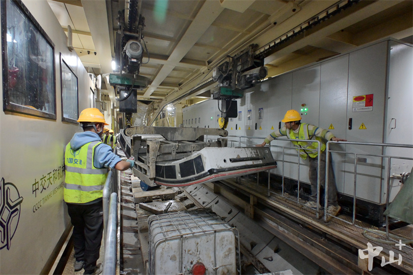 ▲1月10日上午,南中城际中山段岐江新城站至岐江道站盾构区间左线顺利贯通,工人正在清理出口处的渣土。