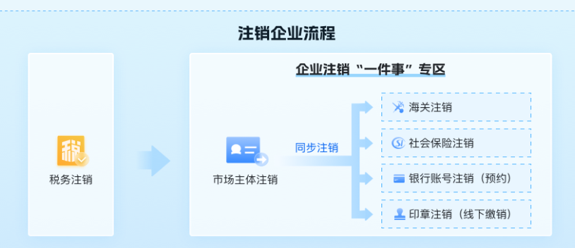 集成办理税务注销、企业注销登记、海关报关单位备案注销、注销社会保险登记、银行账户注销、企业印章注销等事项,实现企业注销登记“一件事”高效办理。