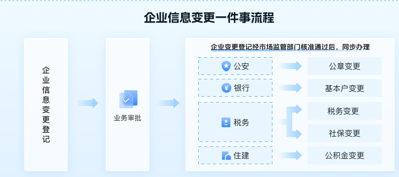 可以办理企业变更登记、企业印章刻制、基本账户变更、税控设备变更发行、社会保险登记变更、住房公积金企业缴存登记变更等事项。