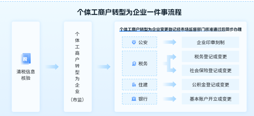 将个体工商户转型为企业涉及的清税信息核验、个体工商户转型为企业变更登记、企业印章刻制、基本账户开立或账户信息变更、社会保险登记或参保信息变更、住房公积金企业缴存登记或信息变更等6个“单事项”集成为“一件事”办理,通过“减材料、减时限、减环节、减跑动”实现“一件事、一次办”,切实优化政务服务流程,提升群众办事效能。