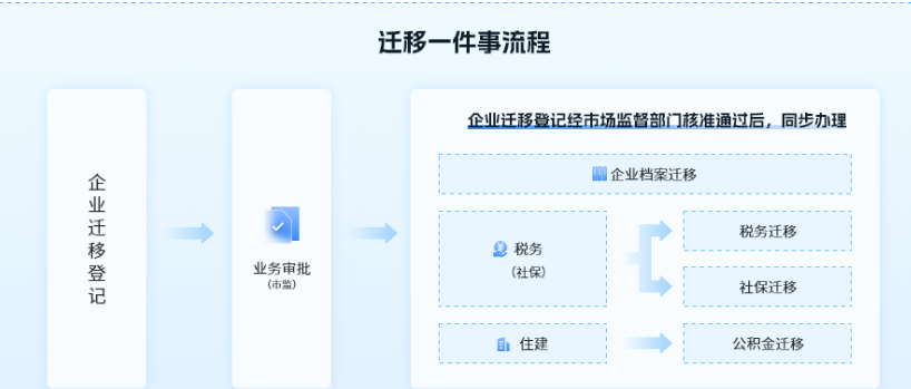按照“迁入地发起、迁出地响应,内部流转、同步办理”的工作方式,实现企业向市场监管部门一次提交企业迁移申请,税务、社保和公积金迁移并联办理。
