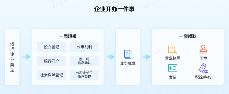 实行企业设立登记、税务一照一码户信息确认、社会保险登记、企业印章刻制、住房公积金企业缴存登记、银行基本账户开立等事项“一次提交、内部流转、同步审核”模式,企业只需一次申请即可完成全流程业务办理。