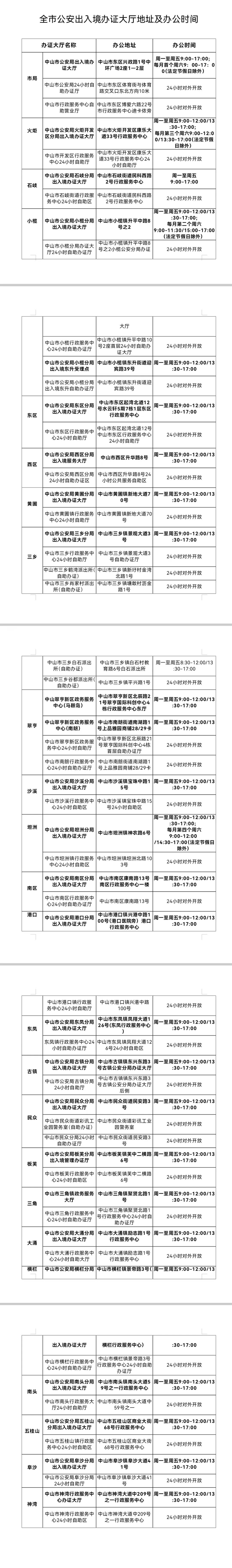·中山市公安局24小时自助办证厅和各镇街出入境业务受理点(详见下图)不受影响。