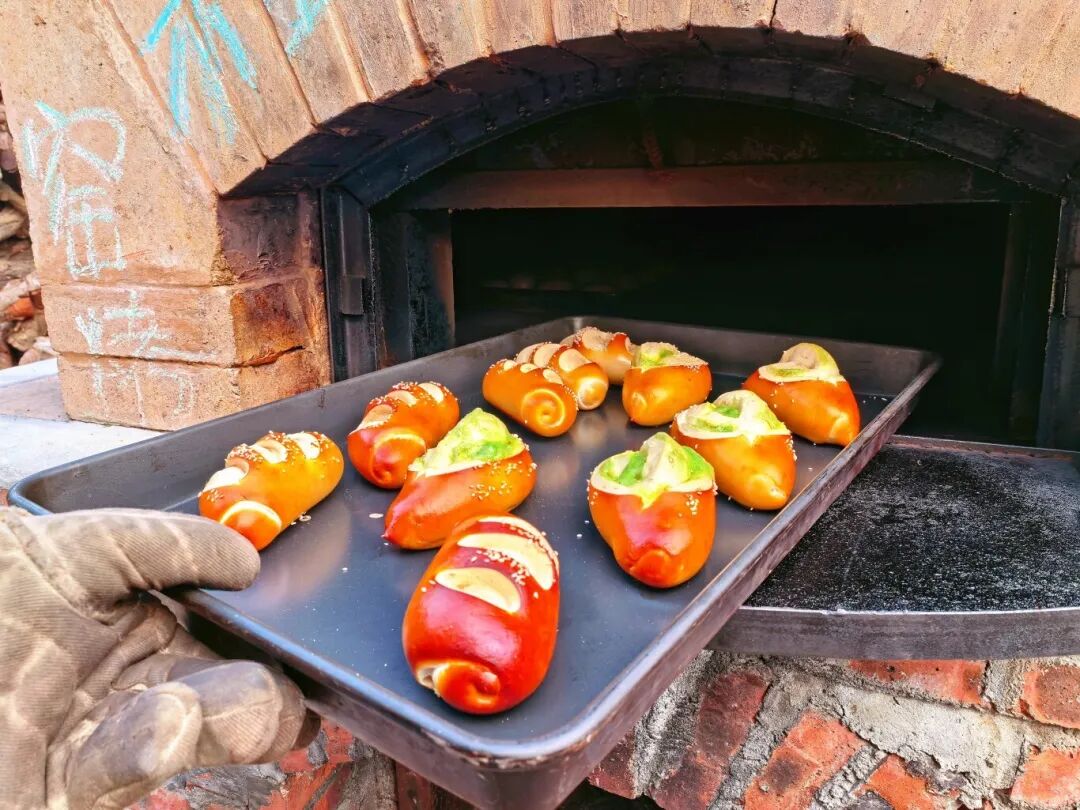 进门后,院子右侧的一个红砖大窑特别引人注目,这就是店里的“灵魂主角”。主理人菲菲说,这里的面包所有馅料都是手工现做的,坚决不用半成品,当天现做现烤才新鲜。而且低糖低油,十分健康。窑烤用的荔枝木是主理人在广州订购的老木料,慢火燃烧时果木香会渐渐渗进面团,是机器烘烤永远复刻不出的烟火气。