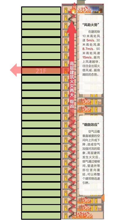 “烟囱效应”致使高层建筑火灾迅速蔓延。“烟囱效应”是指户内空气沿着垂直坡度的空间向上升或下降,造成空气加强对流的现象,高层建筑发生火灾后,烟气通过楼梯间、管道井、玻璃幕墙缝隙等部位以3—4m/s的速度竖向蔓延,可以将整个建筑物迅速引燃。
