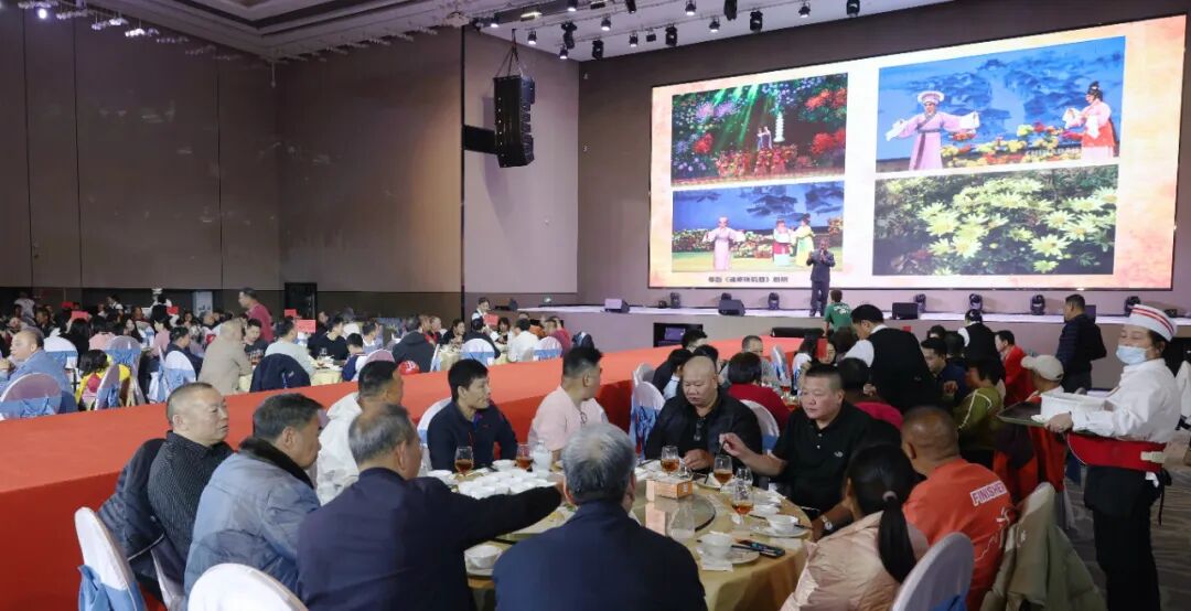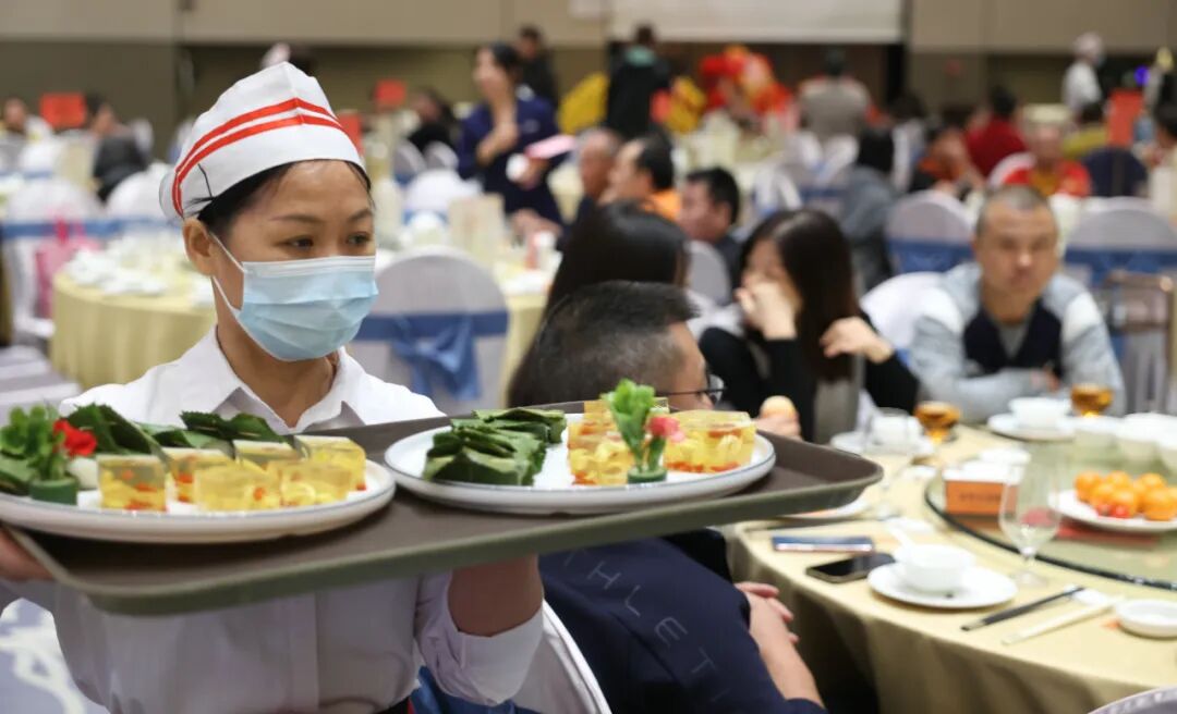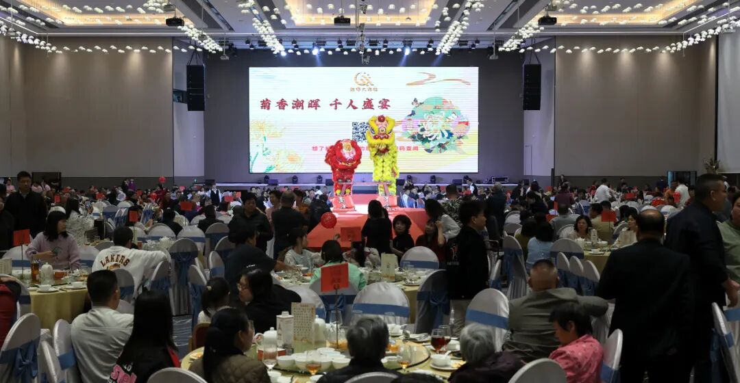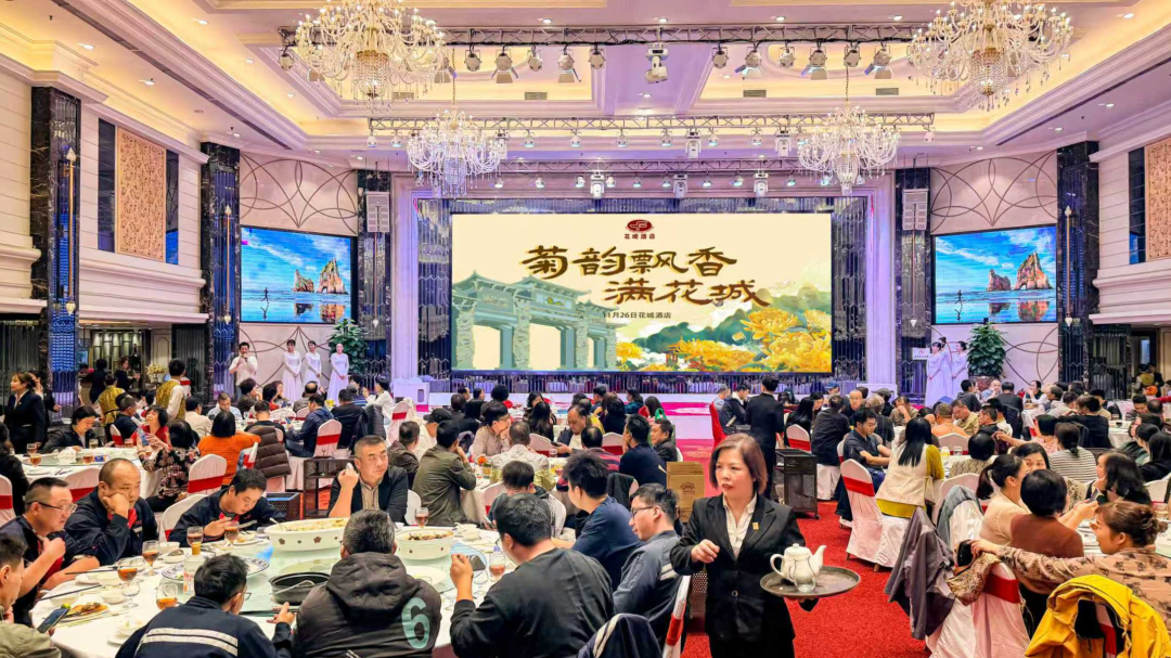 11月28日晚,小榄潮晖大酒楼设宴120席,千人菊花文化晚宴热闹开席。菊花杞子糕清甜软糯、菊花捞起脆肉鲩鲜爽入味、菊花梗炖猪横利汤清润滋补、菊花烙拼菊花手抓鱼球外酥里嫩……多款特色菊花菜式次第上桌,既保留食材本味,又融入菊花清香,让人食欲大开。