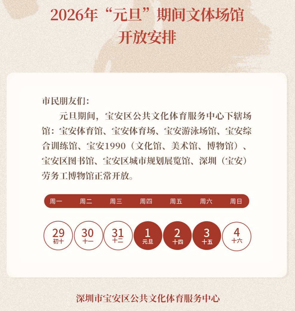 想趁假期运动充电?宝安体育馆、图书馆、博物馆、美术馆等公共场馆在元旦期间正常开放!