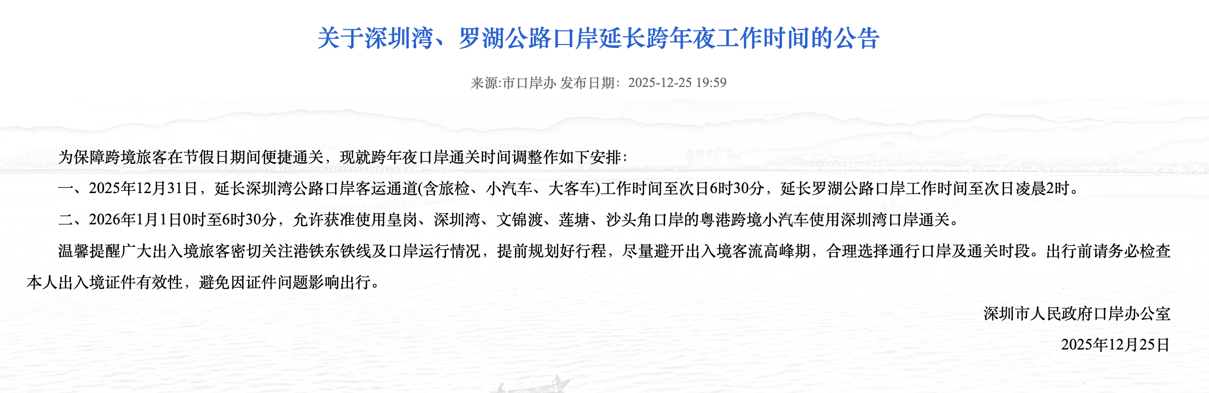 2026年1月1日0时至6时30分,原本走皇岗、文锦渡、莲塘、沙头角口岸的粤港跨境小汽车,全部允许改走深圳湾口岸。
