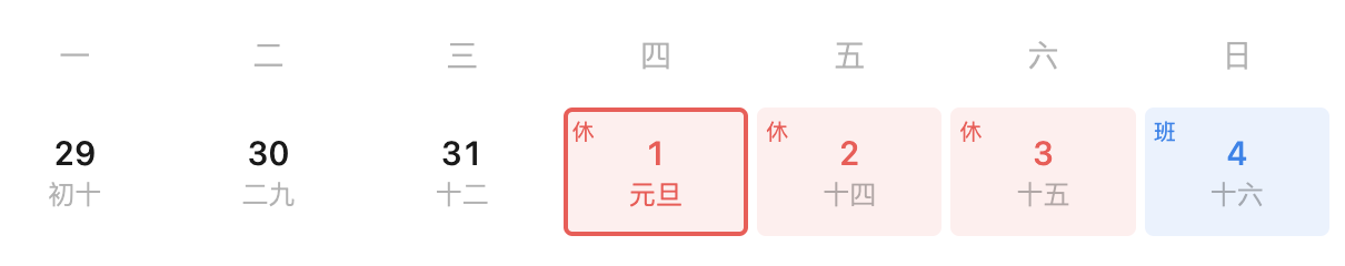 特别注意:1月4日(周日)是要上班的! 闹钟记得提前定好。