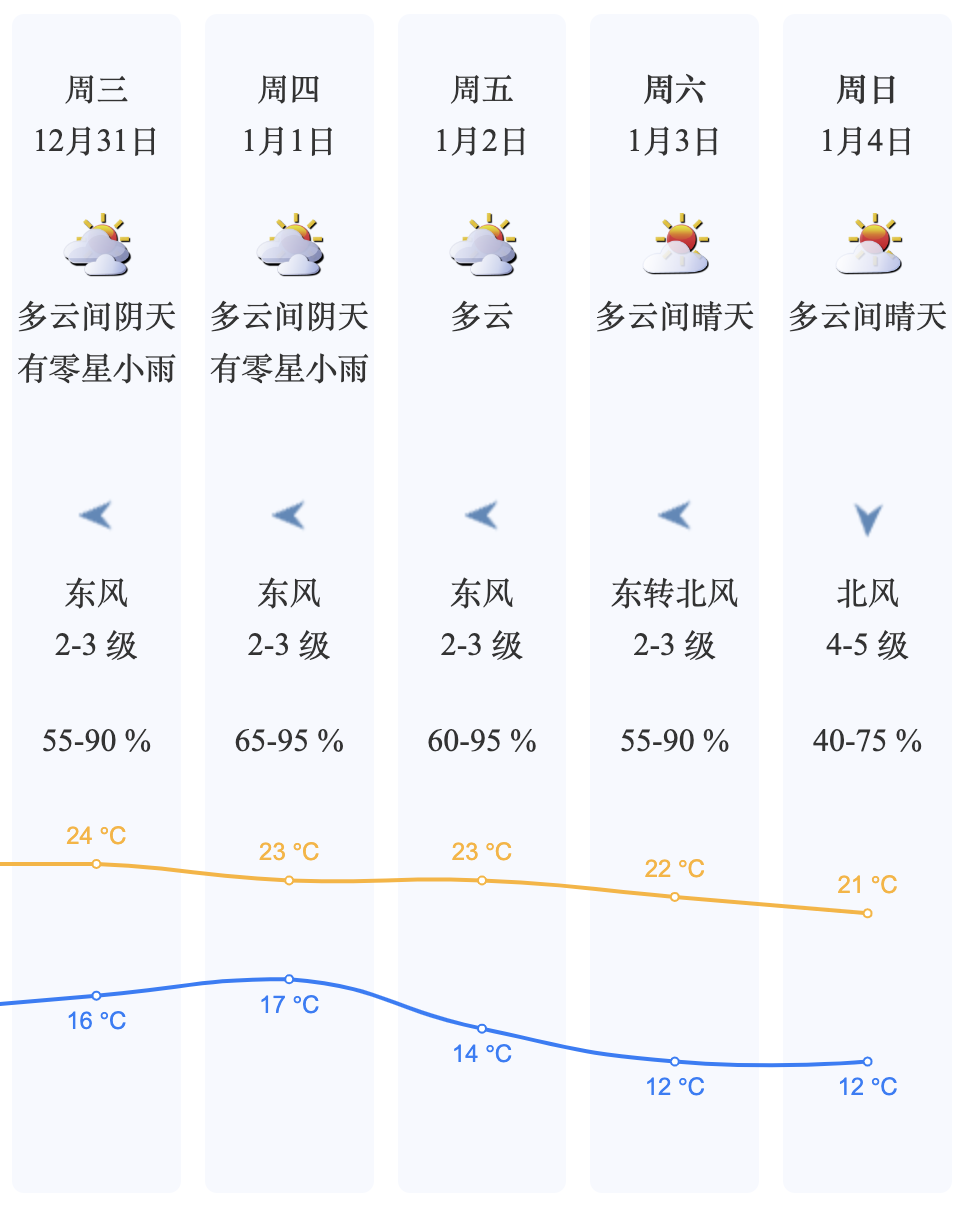 想穿短袖跨年的朋友可能要失望了。受冷空气影响,元旦假期云量增多,还会飘点分散小雨。