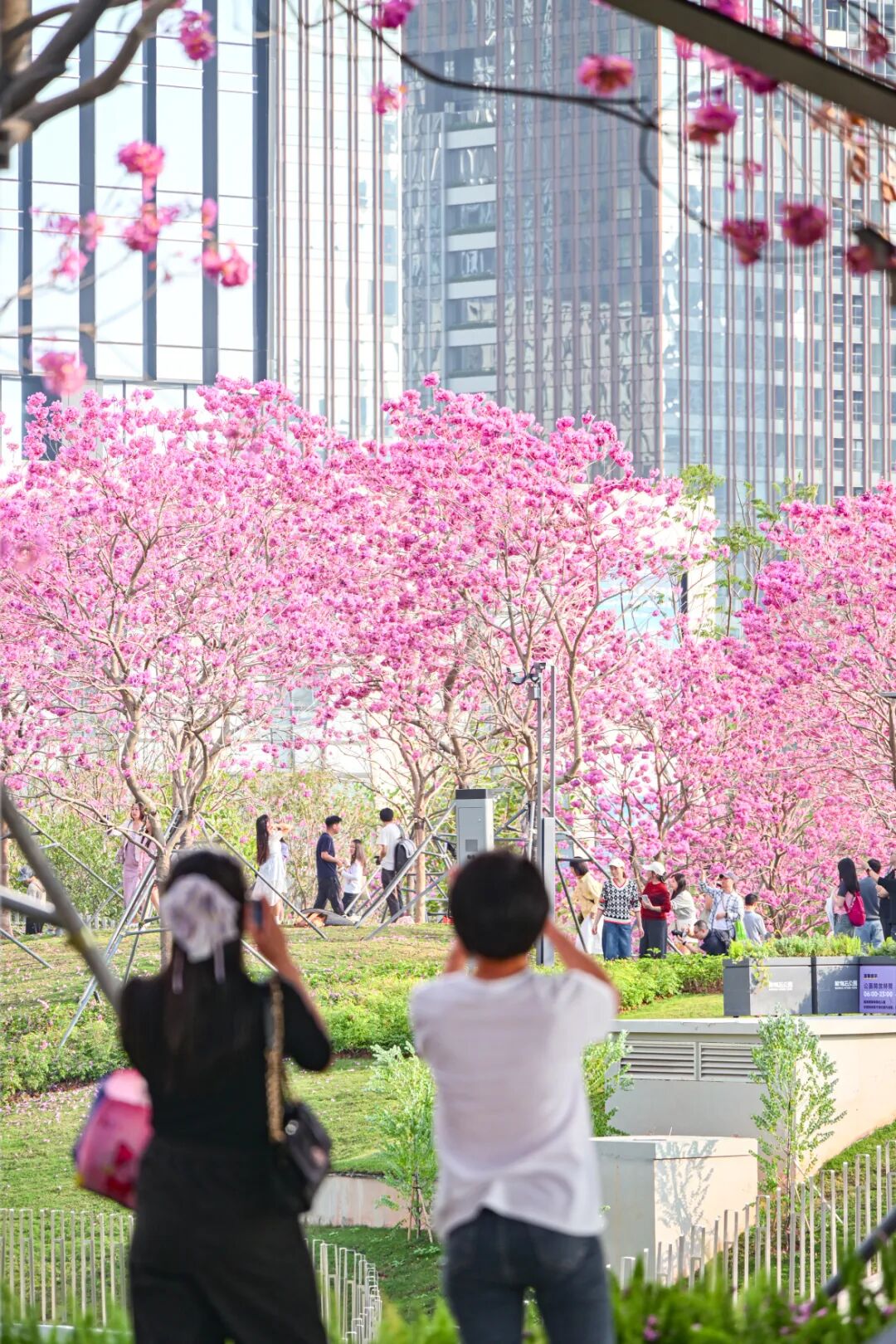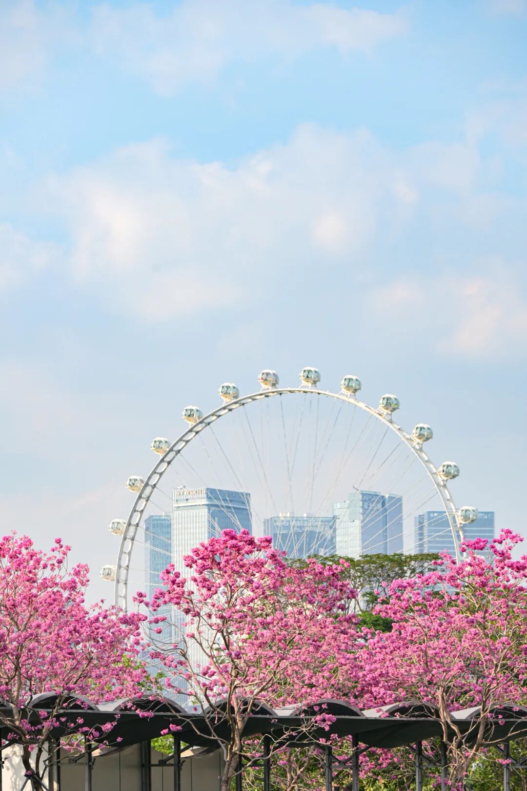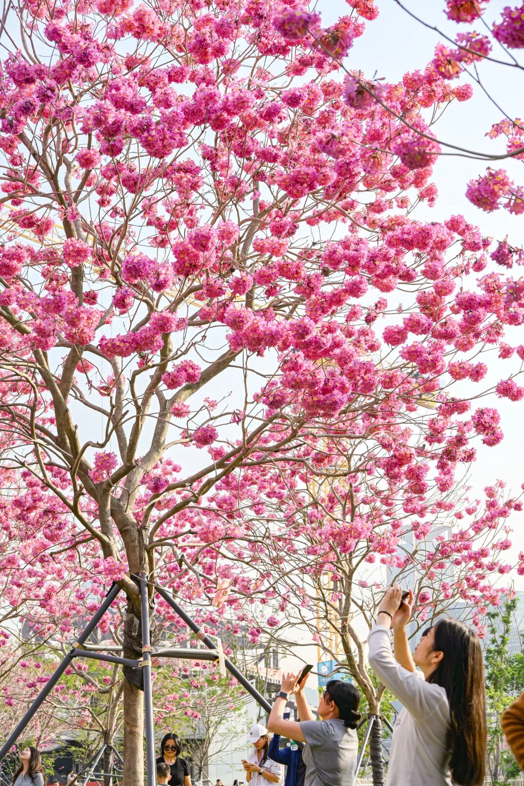 浪漫: 前海石公园桂湾段的紫花风铃木开成了一片海,粉紫色花球配上摩天轮,随手一拍就是大片。
