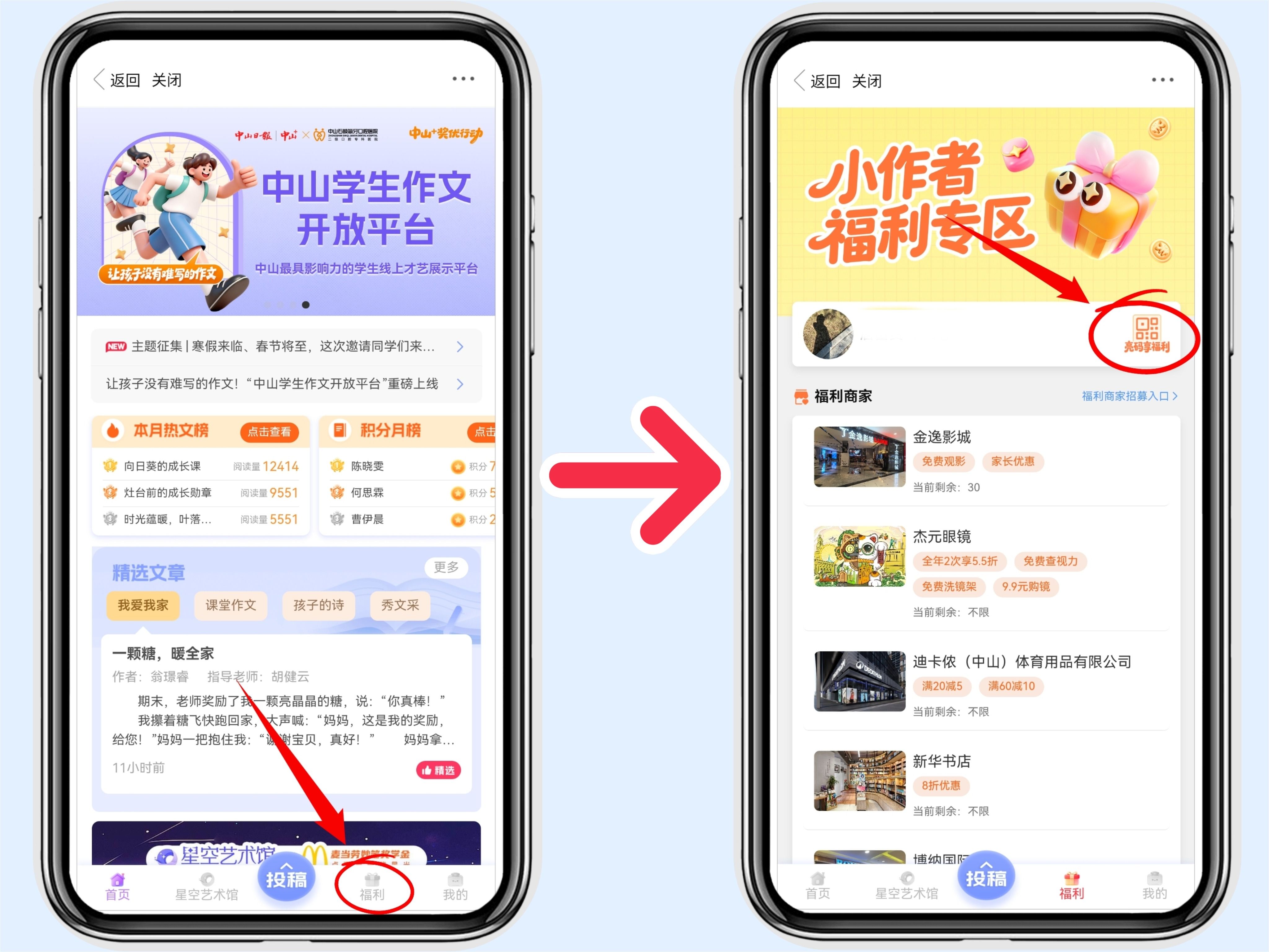 入驻“中山学生作文开放平台”只需3步。成功绑定小作者信息后,即可向我们投稿或领取专属福利: