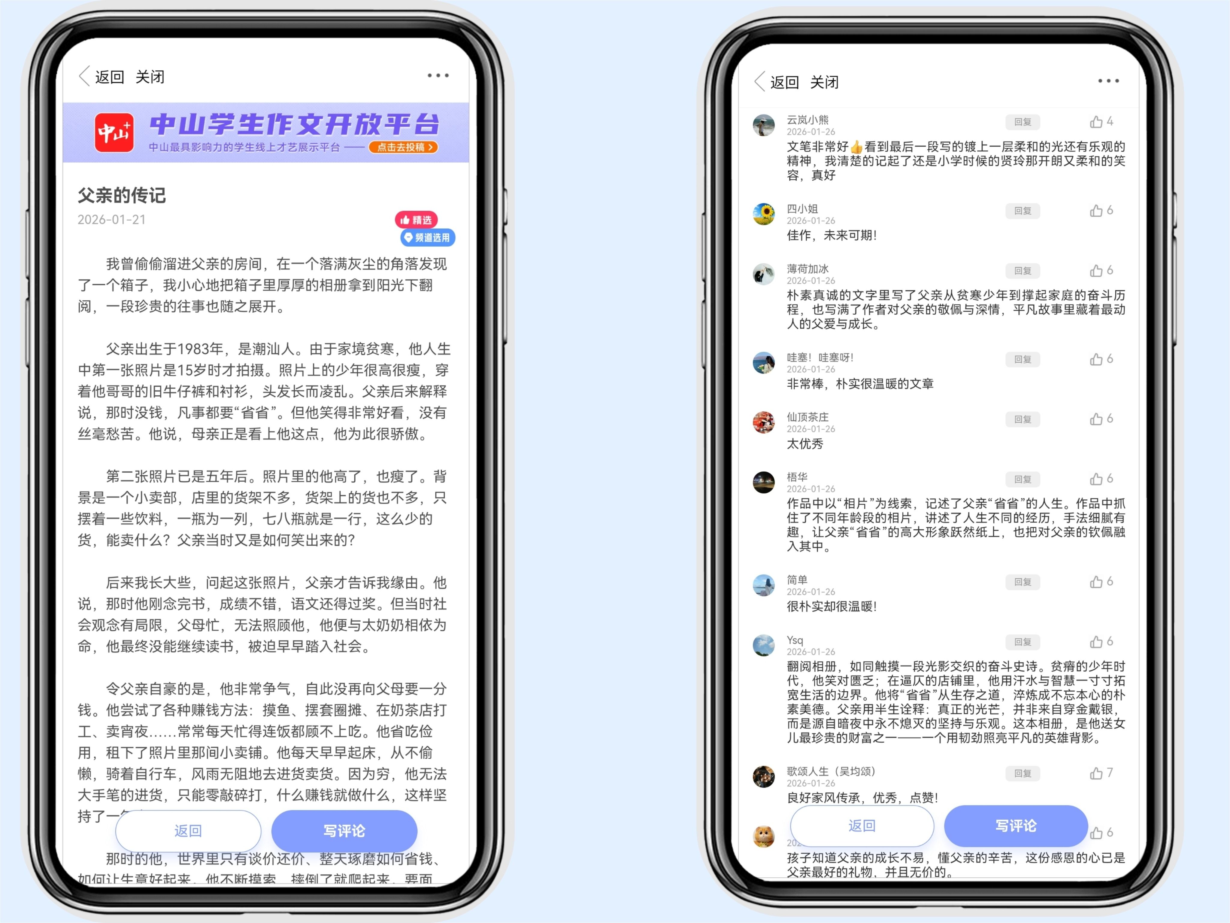 在这里,你不仅能用文字/绘画分享自己的所思所想,还能和同龄小伙伴互评交流,以字传情、以文会友;在这里,小作者入驻即拥有专属主页,记录下个人成长的每一步;在这里,每篇投稿都会被认真对待,优秀文章会被“精选”并推送到平台显眼位置,或者被“中山+”教育频道采用。